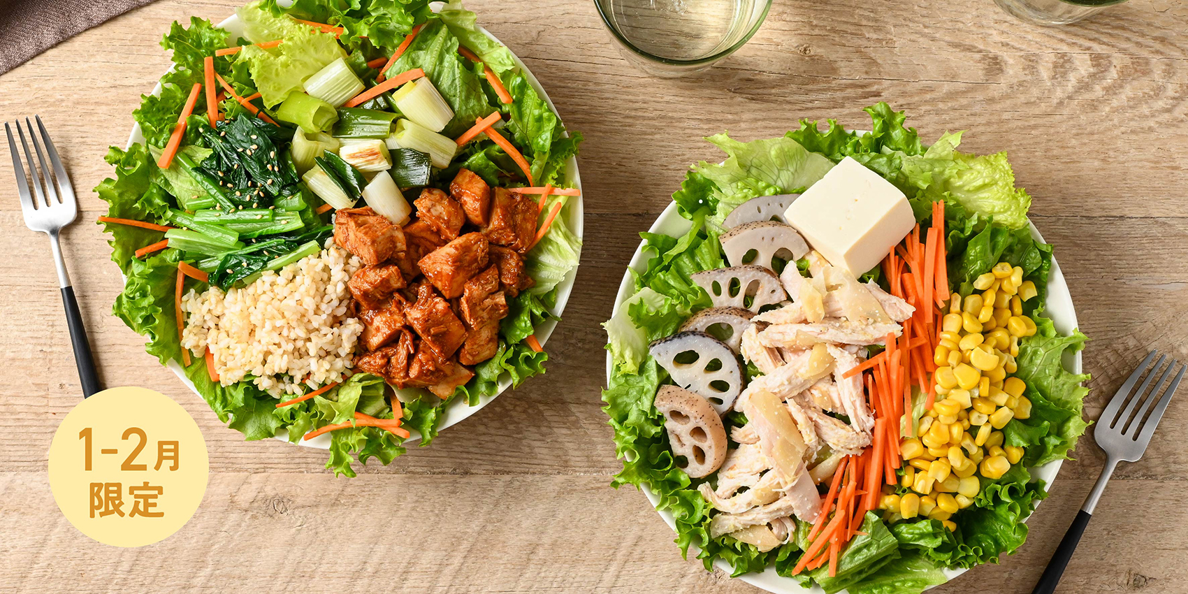四季折々の、国産野菜。しっとり食感を追求した、高タンパク&低糖質な肉。個性的な食材たちのままで調和が叶う、カットサイズと、とろみドレッシング。 サラダボウルとしてのおいしさを追求した、WithGreenこだわりの一杯。